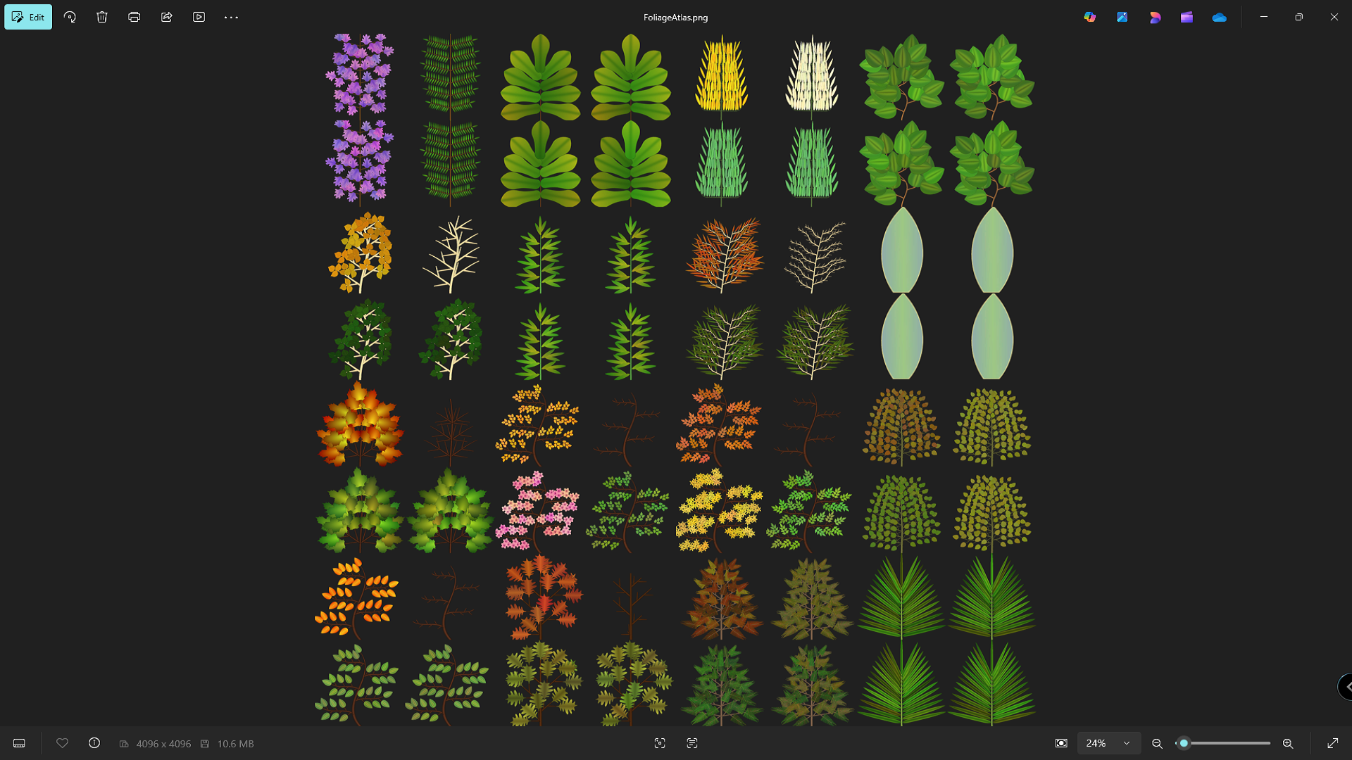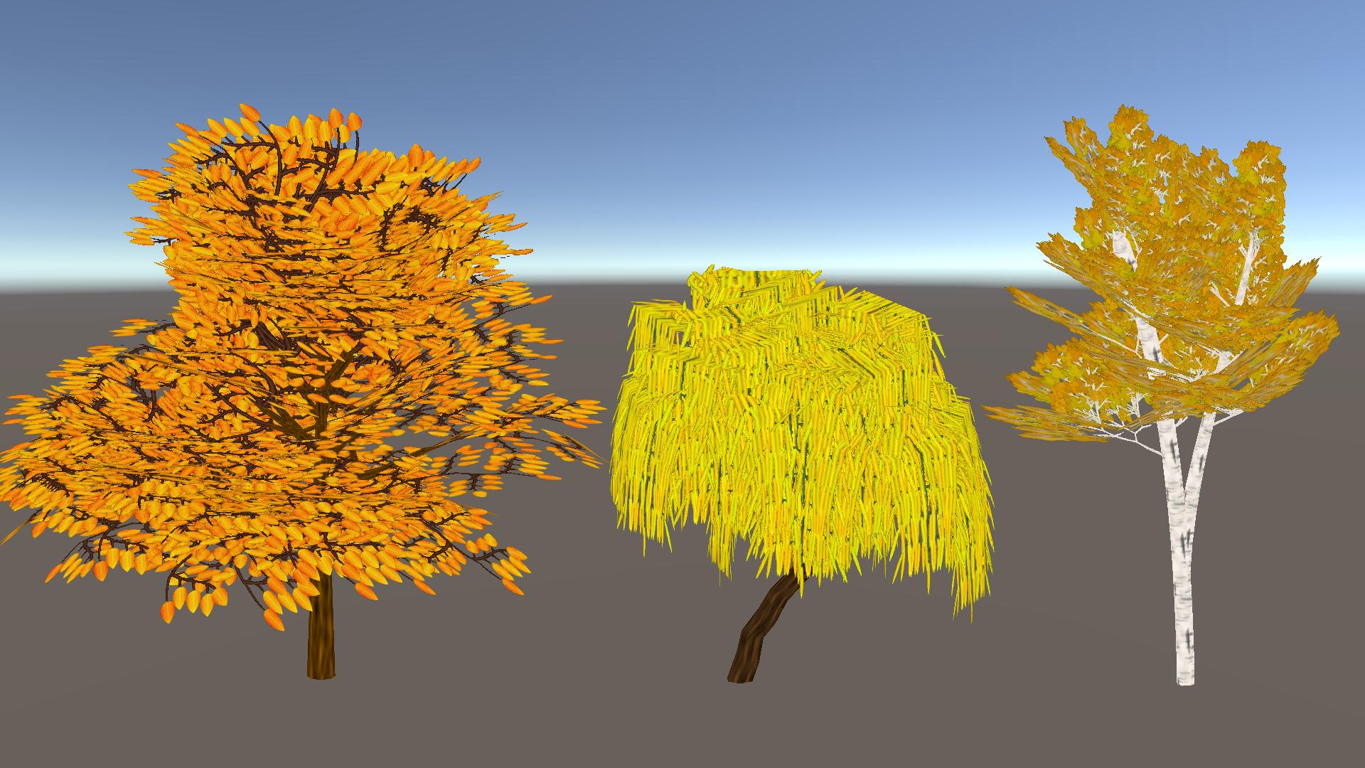 To improve performance foliage textures are packed together, so all trees share material and textures.
